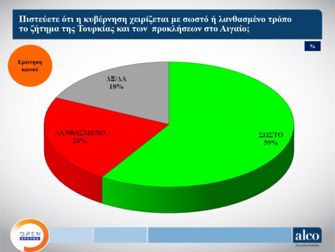 Όσο για το πώς κρίνουν οι πολίτες τον χειρισμό των τουρκικών προκλήσεων στο Αιγαίο, το 59% απαντά πως βρίσκει τον τρόπο σωστό, το 23% λανθασμένο, ενώ υπάρχει και ένα 18% στο «δεν ξέρω, δεν απαντώ».