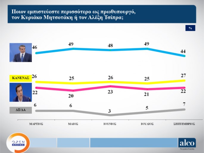 Τα ευρήματα της δημοσκόπησης της Alco για λογαριασμό του Open παρουσιάστηκαν το βράδυ της Πέμπτης στο κεντρικό δελτίο του καναλιού. Σύμφωνα μ’ αυτή η διαφορά ανάμεσα στη Νέα Δημοκρατία και τον ΣΥΡΙΖΑ βρίσκεται στις 16,9 μονάδες, με τον Κυριάκο Μητσοτάκη να συγκεντρώνει ποσοστό 44% ως ο καταλληλότερος για πρωθυπουργός.
