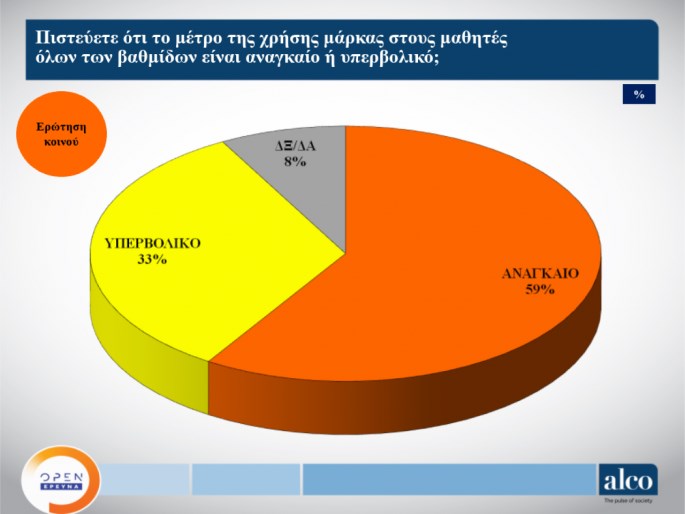 Όσο για το επίμαχο θέμα της μάσκας στους μαθητές των σχολείων και το πώς το κρίνουν οι πολίτες, το 59% απαντά αναγκαίο, το 33% το κρίνει υπερβολικό, ενώ 8% είναι στο «δεν ξέρω, δεν απαντώ».