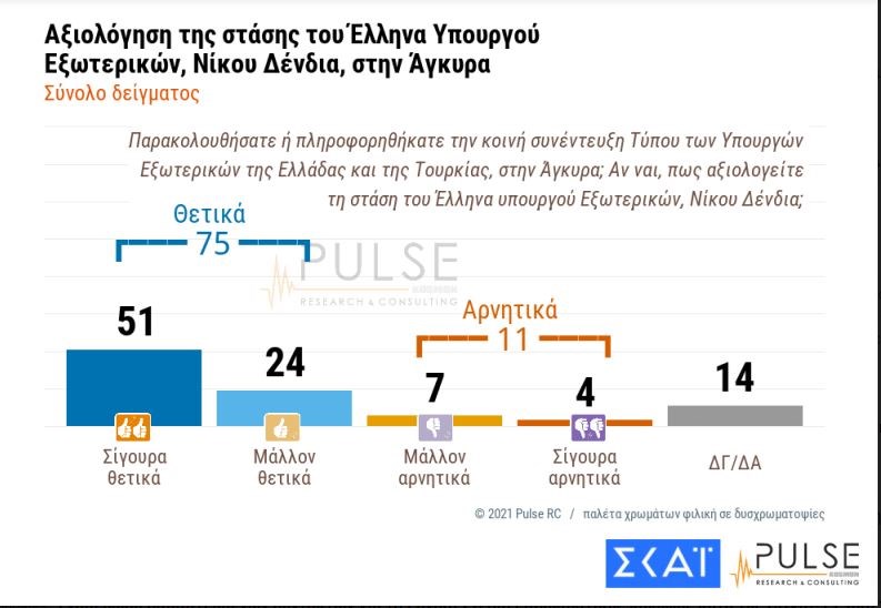 Η πλειοψηφία των πολιτών σε ποσοστό 75% αξιολόγησε θετικά τη στάση του Έλληνα υπουργού Εξωτερικών, Νίκου Δένδια στην Άγκυρα (51% σίγουρα θετικά, 24% μάλλον θετικά) και μόλις το 11% την κρίνει αρνητικά (7% μάλλον αρνητικά, 4% σίγουρα αρνητικά). Στο 14% ανήλθαν οι απαντήσεις «δεν γνωρίζω/δεν απαντώ».