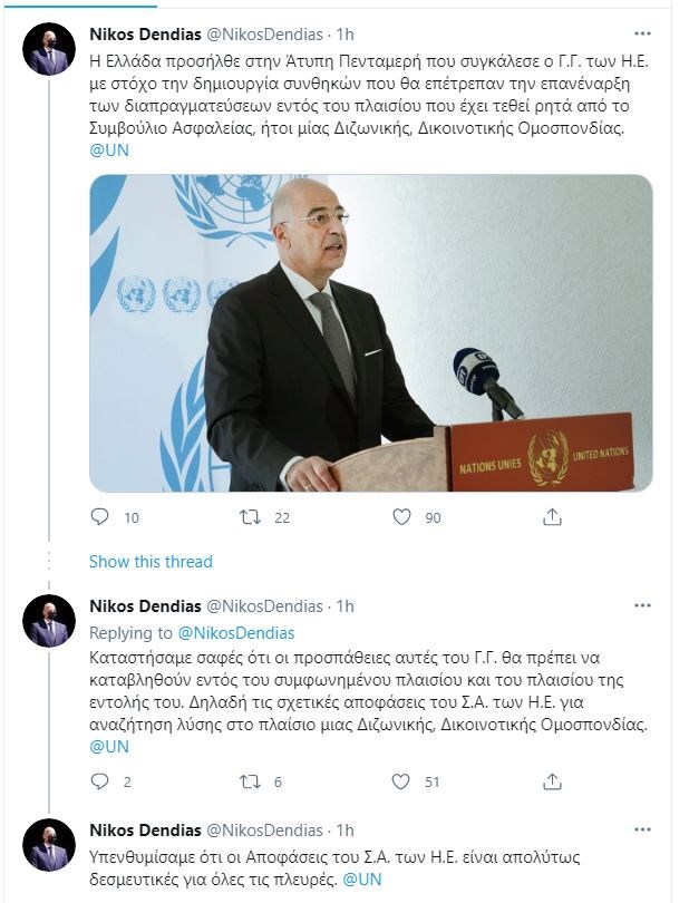 Μετά την άτυπη πενταμερή για το Κυπριακό στη Γενεύη, ο Έλληνας υπουργός Εξωτερικών Νίκος Δένδιας ανέφερε πως «η Ελλάδα προσήλθε στην άτυπη πενταμερή συνάντηση που συγκάλεσε ο γενικός γραμματέας των Ηνωμένων Εθνών με στόχο τη δημιουργία συνθηκών που θα επέτρεπαν την επανέναρξη των διαπραγματεύσεων εντός του πλαισίου που έχει τεθεί ρητά από το Συμβούλιο Ασφαλείας των Ηνωμένων Εθνών, ήτοι μίας διζωνικής, δικοινοτικής ομοσπονδίας». Παράλληλα επεσήμανε ότι: «Στο πλαίσιο αυτό, ήρθαμε στη συνάντηση αυτή υπογραμμίζοντας ότι οποιαδήποτε λύση, εκτός από αυτές τις παραμέτρους, πρέπει να είναι απολύτως συμβατή με το ευρωπαϊκό κεκτημένο. Δείξαμε εποικοδομητική στάση. Καταβάλαμε μαζί με την Κυπριακή Δημοκρατία προσπάθειες για την επίτευξη αυτού του στόχου. Δυστυχώς, δεν κατέστη δυνατόν να βρεθεί κοινό έδαφος για την έναρξη των διαπραγματεύσεων στο πλαίσιο αυτό, λόγω της στάσης της τουρκοκυπριακής και της τουρκικής πλευράς».