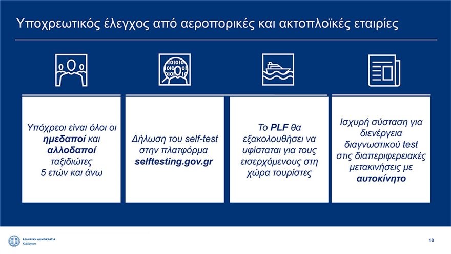 Ο έλεγχος των παραπάνω θα πραγματοποιείται υποχρεωτικά από τις αεροπορικές και τις ακτοπλοϊκές εταιρίες, και υπόχρεοι θα είναι όλοι οι ημεδαποί και αλλοδαποί ταξιδιώτες άνω των 5 ετών.