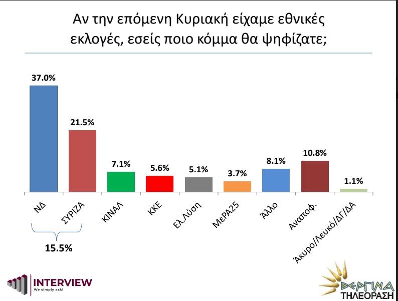 Νέα πανελλαδική δημοσκόπηση από τις 11 έως τις 17 Μαΐου διενήργησε η Interview για λογαριασμό της “Βεργίνα Τηλεόραση” με τη ΝΔ να συνεχίζει να καταγράφει διψήφιο προβάδισμα στην πρόθεση ψήφου έναντι του ΣΥΡΙΖΑ. Συγκεκριμένα, το κυβερνών κόμμα συγκεντρώνει ποσοστό 37% έναντι 21,5% της Αξιωματικής Αντιπολίτευσης. Στην 3η θέση είναι το ΚΙΝΑΛ με 7,1%, ακολουθεί το ΚΚΕ με 5,6%, η Ελληνική Λύση με 5,1% και το MεΡΑ25 με 3,7%. Το “Άλλο Κόμμα” είναι στο 8,1%, οι αναποφάσιστοι στο 10,8% και το «άκυρο/λευκό» συγκεντρώνει 1,1%.