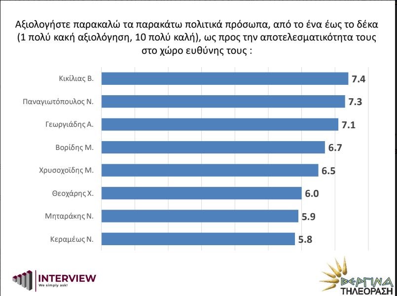 Στην αξιολόγηση των υπουργών ως προς την αποτελεσματικότητα τους, προηγείται ο υπουργός Υγείας, Βασίλης Κικίλιας με 7.4 με άριστα το 10, ακολουθεί ο υπουργός Εθνικής Άμυνας, Νίκος Παναγιωτόπουλος με 7.3, στην 3η θέση ο Άδωνις Γεωργιάδης με 7.1, ενώ την 4άδα κλείνει ο Μάκης Βορίδης με 6.7.