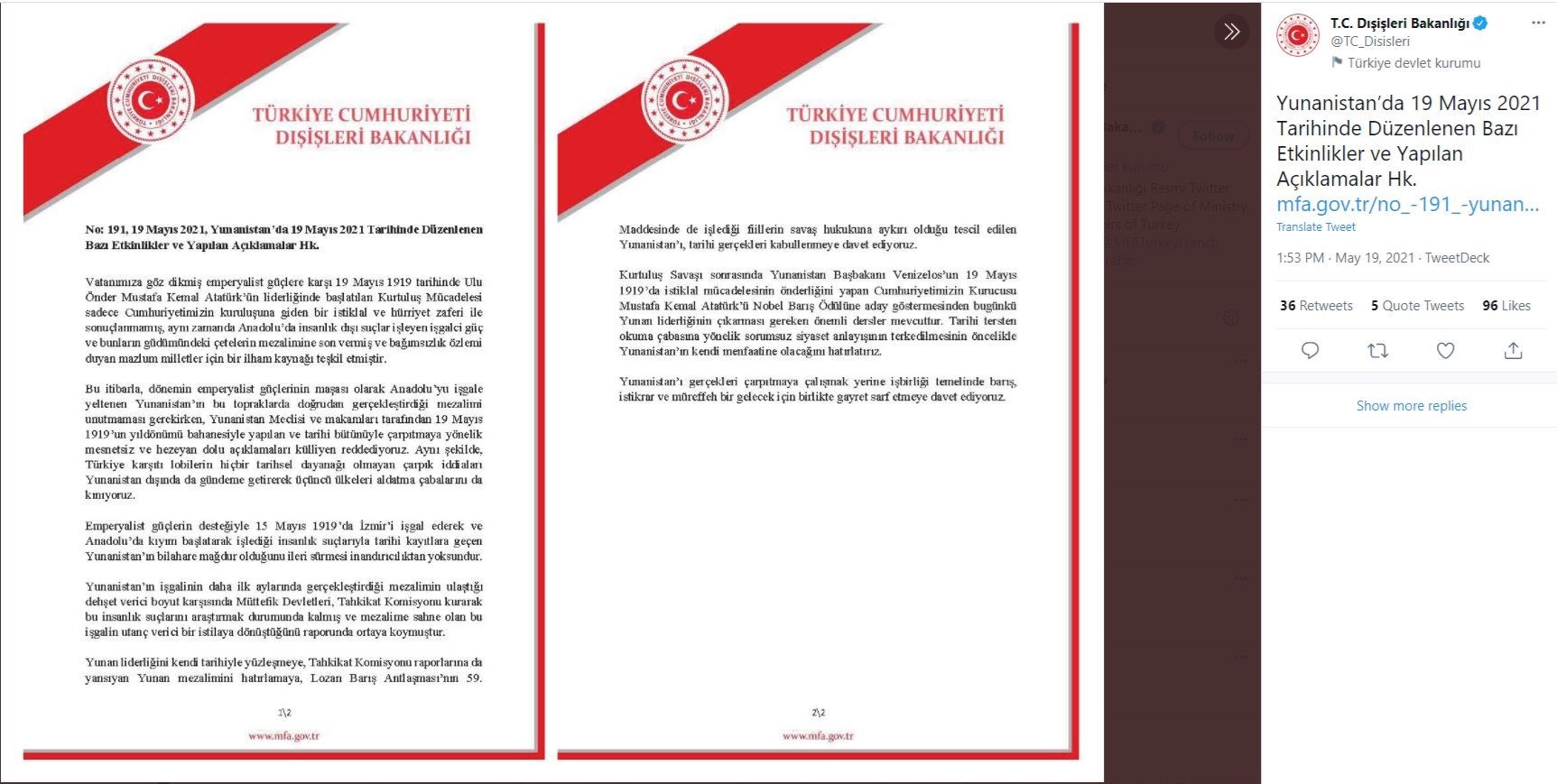 Κανονικά η Ελλάδα, η οποία προσπάθησε να εισβάλει στην Ανατολία ως εργαλείο άλλων ιμπεριαλιστικών δυνάμεων της εποχής, δεν πρέπει να ξεχνά τις φρικαλεότητες που διαπράχθηκαν σε αυτά τα εδάφη. Γι’ αυτό και απορρίπτουμε ως εντελώς αβάσιμες και ως παραληρηματικές τις δηλώσεις του Ελληνικού Κοινοβουλίου και των αρχών με το πρόσχημα της επετείου της 19ης Μαΐου 1919, που διαστρεβλώνουν εντελώς την ιστορία. Ομοίως, καταδικάζουμε τις προσπάθειες των λόμπι εκείνων, εκτός της Ελλάδας, που στρέφονται ενάντια στην Τουρκία, προκειμένου να εξαπατήσουν τρίτες χώρες προβάλλοντας στρεβλές κατηγορίες, οι οποίες δεν έχουν ιστορική βάση.
