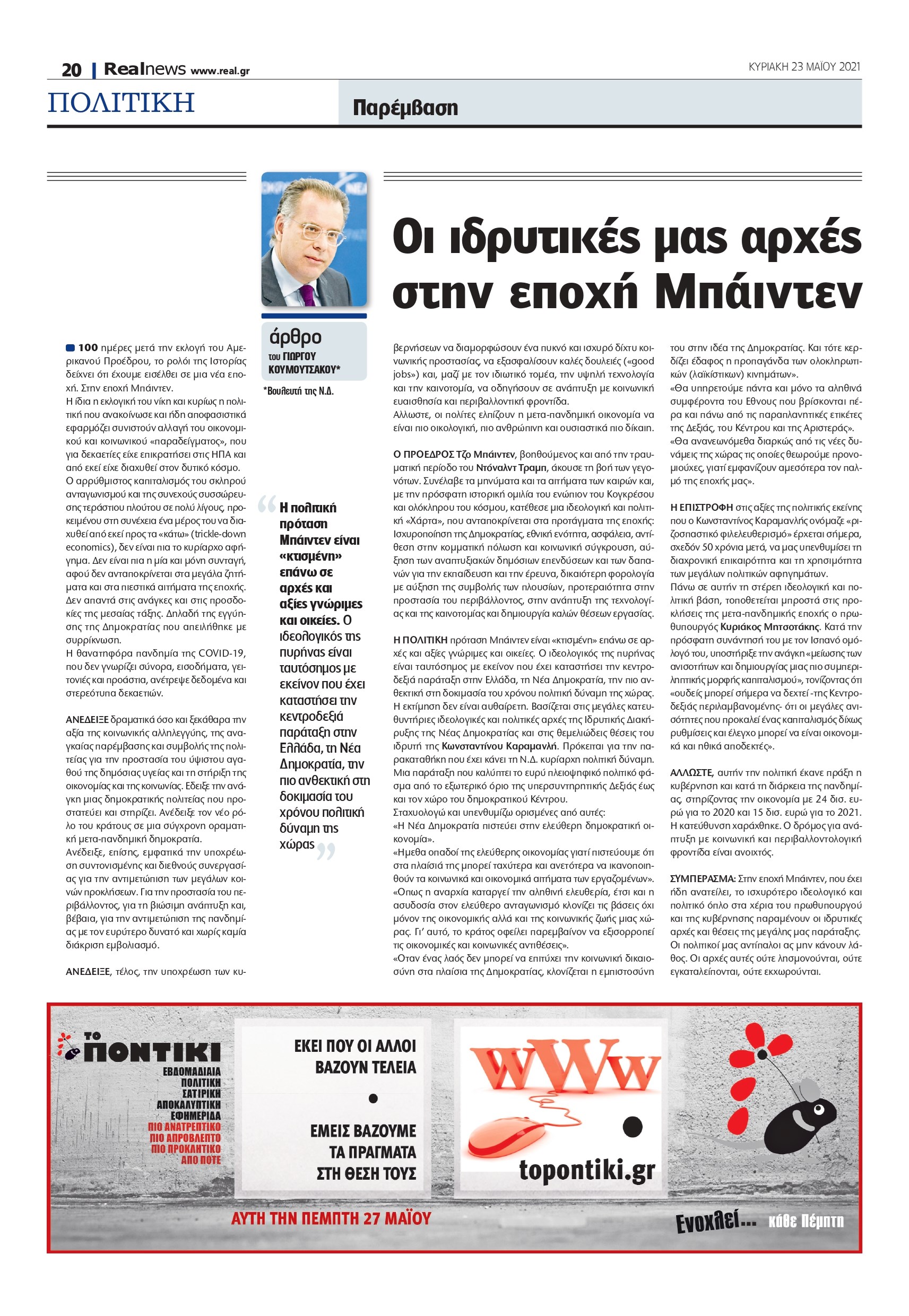 100 ημέρες μετά την εκλογή του Αμερικανού Προέδρου, το ρολόι της Ιστορίας δείχνει ότι έχουμε εισέλθει σε μια νέα εποχή. Στην εποχή Μπάιντεν. Η ίδια η εκλογική του νίκη και κυρίως η πολιτική που ανακοίνωσε και ήδη αποφασιστικά εφαρμόζει συνιστούν αλλαγή του οικονομικού και κοινωνικού «παραδείγματος», που για δεκαετίες είχε επικρατήσει στις ΗΠΑ και από εκεί είχε διαχυθεί στον δυτικό κόσμο. Ο αρρύθμιστος καπιταλισμός του σκληρού ανταγωνισμού και της συνεχούς συσσώρευσης τεράστιου πλούτου σε πολύ λίγους, προκειμένου στη συνέχεια ένα μέρος του να διαχυθεί από εκεί προς τα «κάτω» (trickle-down economics), δεν είναι πια το κυρίαρχο αφήγημα. Δεν είναι πια η μία και μόνη συνταγή, αφού δεν ανταποκρίνεται στα μεγάλα ζητήματα και στα πιεστικά αιτήματα της εποχής. Δεν απαντά στις ανάγκες και στις προσδοκίες της μεσαίας τάξης. Δηλαδή της εγγύησης της Δημοκρατίας που απειλήθηκε με συρρίκνωση. Η θανατηφόρα πανδημία της COVID-19, που δεν γνωρίζει σύνορα, εισοδήματα, γειτονιές και προάστια, ανέτρεψε δεδομένα και στερεότυπα δεκαετιών. Ανέδειξε δραματικά όσο και ξεκάθαρα την αξία της κοινωνικής αλληλεγγύης, της αναγκαίας παρέμβασης και συμβολής της πολιτείας για την προστασία του ύψιστου αγαθού της δημόσιας υγείας και τη στήριξη της οικονομίας και της κοινωνίας. Εδειξε την ανάγκη μιας δημοκρατικής πολιτείας που προστατεύει και στηρίζει. Ανέδειξε τον νέο ρόλο του κράτους σε μια σύγχρονη οραματική μετα-πανδημική δημοκρατία. Ανέδειξε, επίσης, εμφατικά την υποχρέωση συντονισμένης και διεθνούς συνεργασίας για την αντιμετώπιση των μεγάλων κοινών προκλήσεων. Για την προστασία του περιβάλλοντος, για τη βιώσιμη ανάπτυξη και, βέβαια, για την αντιμετώπιση της πανδημίας με τον ευρύτερο δυνατό και χωρίς καμία διάκριση εμβολιασμό.