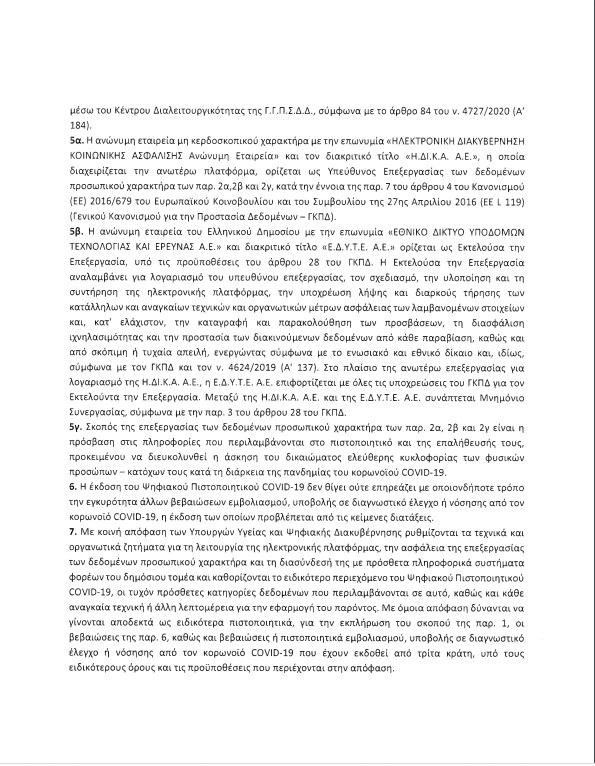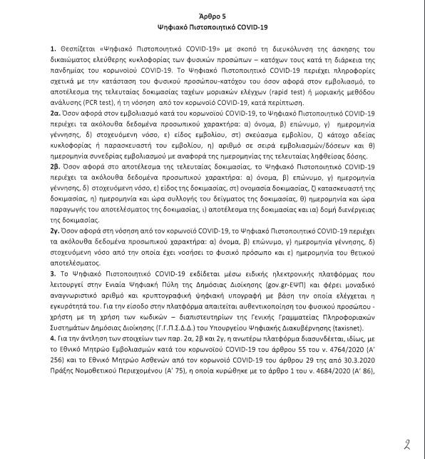 Κατατέθηκε στη Βουλή η τροπολογία για τη θέσπιση ψηφιακού πιστοποιητικού covid-19. Σ’ αυτό θα καταγράφονται πληροφορίες για τον εμβολιασμό κατά του κορονοϊού, τα κάθε είδους τεστ ελέγχου στα οποία έχει υποβληθεί ο κάτοχός του είτε τη νόσηση από τον κορονοϊό, ενώ θα χρησιμοποιείται για την άσκηση του δικαιώματος της ελεύθερης κυκλοφορίας των κατόχων του κατά τη διάρκεια της πανδημίας. Το πιστοποιητικό εκδίδεται μέσω ειδικής ηλεκτρονικής πλατφόρμας στην Ενιαία Ψηφιακή Πύλη gov.gr – ΕΨΠ και διασυνδέεται με το Εθνικό Μητρώο Εμβολιασμών και το Εθνικό Μητρώο Ασθενών.
