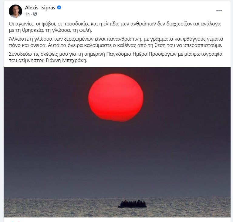 «Οι αγωνίες, οι φόβοι, οι προσδοκίες και η ελπίδα των ανθρώπων δεν διαχωρίζονται ανάλογα με τη θρησκεία, τη γλώσσα, τη φυλή», τονίζει ο Αλέξης Τσίπρας σε ανάρτησή του στο Facebook με αφορμή τη σημερινή Παγκόσμια Ημέρα Προσφύγων.