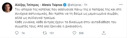 «Κάθε γυναίκα, κάθε άντρας έχουν το δικαίωμα στην αυτοδιάθεση του σώματός τους. Από εκεί ξεκινάει η Δικαιοσύνη», συμπληρώνει στο tweet του ο κ. Τσίπρας.
