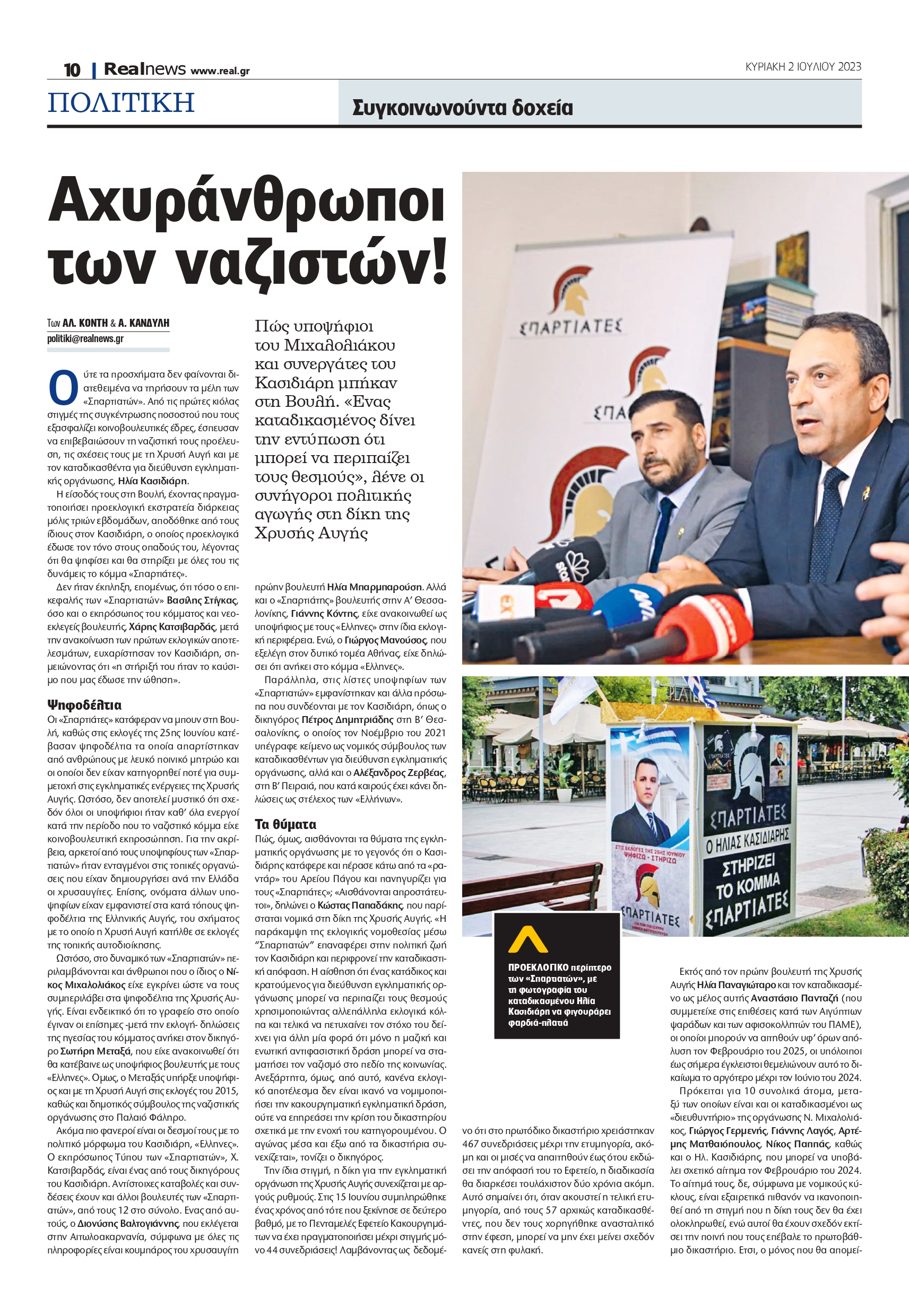Παράλληλα, στις λίστες υποψηφίων των «Σπαρτιατών» εμφανίστηκαν και άλλα πρόσωπα που συνδέονται με τον Κασιδιάρη, όπως ο δικηγόρος Πέτρος Δημητριάδης στη Β’ Θεσσαλονίκης, ο οποίος τον Νοέμβριο του 2021 υπέγραφε κείμενο ως νομικός σύμβουλος των καταδικασθέντων για διεύθυνση εγκληματικής οργάνωσης, αλλά και ο Αλέξανδρος Ζερβέας, στη Β’ Πειραιά, που κατά καιρούς έχει κάνει δηλώσεις ως στέλεχος των «Ελλήνων».
