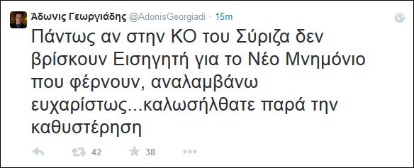 «Πάντως αν στην ΚΟ του Σύριζα δεν βρίσκουν Εισηγητή για το Νέο Μνημόνιο που φέρνουν, αναλαμβάνω ευχαρίστως…καλωσήλθατε παρά την καθυστέρηση», έγραψε ο βουλευτής της Νέας Δημοκρατίας.