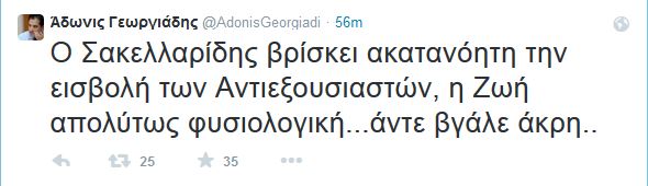 Τις δηλώσεις της Ζωής Κωνσταντοπούλου και του Γαβριήλ Σακελλαρίδης, για την εισβολή των αντιεξουσιαστών, στο προαύλιο χώρο της Βουλής, σχολίασε ο κοινοβουλευτικός εκπρόσωπος της Νέας Δημοκρατίας, Άδωνις Γεωριάδης, μέσω του προσωπικού του λογαριασμού στο Twitter. Αναλυτικά έγραψε:  «Ο Σακελλαρίδης βρίσκει ακατανόητη την εισβολή των Αντιεξουσιαστών, η Ζωή απολύτως φυσιολογική… άντε βγάλε άκρη».