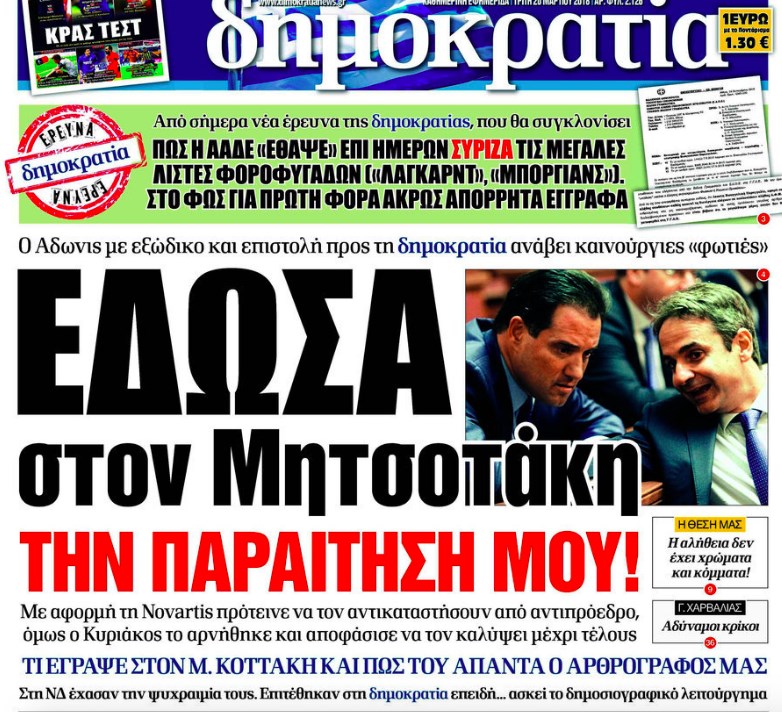 Με τον τίτλο: «Έσπευσα αμέσως στον Μητσοτάκη και του έθεσα υπ’ όψιν την παραίτησή μου», η εφημερίδα “Δημοκρατία” στο πρωτοσέλιδο θέμα της, δημοσιοποιεί την επιστολή που απέστειλε προς την εφημερίδα ο Άδωνις Γεωργιάδης. Με την επιστολή αυτή, ο κ. Γεωργιάδης απαντά στο άρθρο του Μανώλη Κοττάκη με τον τίτλο «Ξέρει τι να κάνει αν αγαπάει την παράταξη». Αυτή έχει ως εξής: