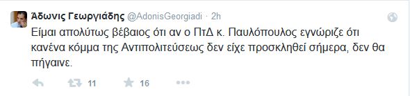 Τη στήριξη του στον Πρόεδρο της Δημοκρατίας, Προκόπη Παυλόπουλο, για την παρουσία του στην επιτροπή για το χρέος, εξέφρασε ο Άδωνις Γεωργιάδης, με ανάρτηση του στο Twitter. Ο κ. Γεωργιάδης έγραψε: «Είμαι απολύτως βέβαιος ότι αν ο Πρόεδρος της Δημοκρατίας, κ. Παυλόπουλος γνώριζε ότι κανένα κόμμα της Αντιπολιτεύσεως δεν είχε προσκληθεί σήμερα, δεν θα πήγαινε».