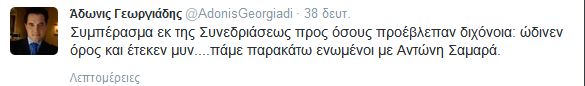 Τη συνεδρίαση της κοινοβουλευτικής ομάδας της Νέας Δημοκρατίας, σχολίασε μέσω του προσωπικού του λογαριασμού στο Twitter, ο Άδωνις Γεωργιάδης, επισημαίνοντας ότι «πάμε παρακάτω ενωμένοι με Αντώνη Σαμαρά». Αναλυτικά όσα έγραψε στο Twitter: «Συμπέρασμα εκ της Συνεδριάσεως προς όσους προέβλεπαν διχόνοια: ώδινεν όρος και έτεκεν μυν….πάμε παρακάτω ενωμένοι με Αντώνη Σαμαρά».