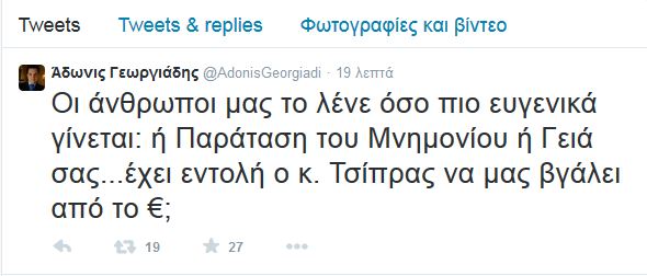 Την απόρριψη της ελληνικής κυβέρνησης στο σχέδιο που πρότειναν οι εταίροι κατά τη διάρκεια του Eurogroup, σχολίασε ο Άδωνις Γεωργιάδης μέσω του προσωπικού του λογαριασμού στο twitter. Συγκεκριμένα ο κ Γεωργιάδης έγραψε: «Οι άνθρωποι μας το λένε όσο πιο ευγενικά γίνεται: ή Παράταση του Μνημονίου ή γειά σας… έχει εντολή ο κ. Τσίπρας να μας βγάλει από το €;