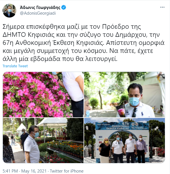 Την 67η Ανθοκομική Έκθεση Κηφισιάς επισκέφθηκε την Κυριακή ο υπουργός Ανάπτυξης και Επενδύσεων Άδωνις Γεωργιάδης. «Απίστευτη ομορφιά και μεγάλη συμμετοχή του κόσμου» έγραψε ο κ. Γεωργιάδης στα μέσα κοινωνικής δικτύωσης .