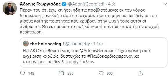Την έντονη αντίδραση του υπουργού Ανάπτυξης και Επενδύσεων, Άδωνι Γεωργιάδη, προκάλεσε μήνυμα χρήστη του Twitter που υποστήριζε ότι “πέθανε ο γιος του”. Με ανάρτησή του στο Twitter αναφέρει ότι έχει κινηθεί νομικά, ενώ κάλεσε τους χρήστες να κάνουν report. “Πέραν του ότι έχω κινήσει ήδη τις προβλεπόμενες εκ του νόμου διαδικασίες, ανεβάζω αυτό το αχαρακτήριστο μήνυμα, ως δείγμα του μίσους και της ποιότητας που κρύβουν στην ψυχή τους αυτοί οι άνθρωποι. Θα εκτιμούσα τα μαζικά report πάντως σε αυτή την αισχρή περίπτωση” αναφέρει ο αντιπρόεδρος της ΝΔ.