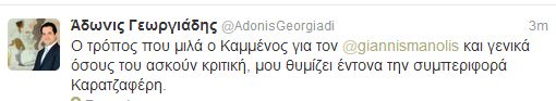 Ο Βουλευτής της Νέας Δημοκρατίας, Άδωνις Γεωργιάδης έγραψε πριν από λίγο, ότι ο Πάνος Καμμένος του θυμίζει τον άνθρωπο που είχε πρόεδρο τον καιρό που ανήκε στον ΛΑΟΣ. Σημείωσε στο twitter : “Ο τρόπος που μιλά ο Καμμένος για τον Γιάννη Μανώλη και γενικά όσους του ασκούν κριτική, μου θυμίζει έντονα την συμπεριφορά Καρατζαφέρη.”