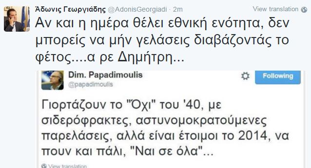Ο Άδωνις Γεωργιάδης, ανέβασε στον προσωπικό του λογαριασμό ένα παλιό tweet του Δημήτρη Παπαδημούλη, από πέρυσι, την ημέρα του εορτασμού της 28ης Οκτωβρίου.