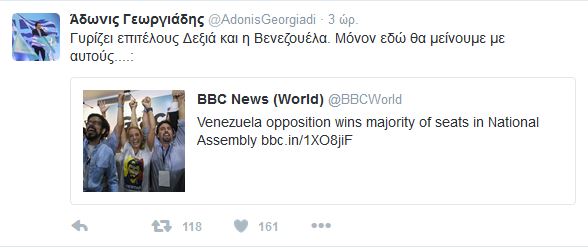 Τη νίκη της αντιπολίτευσης στη Βενεζουέλα, η οποία κερδίζει την πλειοψηφία στο κοινοβούλιο για πρώτη φορά τα τελευταία 16 χρόνια, σχολιάζει με μήνυμα του στο Twitter, ο υποψήφιος για την προεδρία της ΝΔ, Άδωνις Γεωργιάδης.