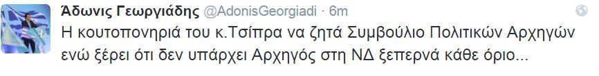 «Η κουτοπονηριά του κ.Τσίπρα να ζητά Συμβούλιο Πολιτικών Αρχηγών ενώ ξέρει ότι δεν υπάρχει Αρχηγός στη ΝΔ ξεπερνά κάθε όριο…», έγραψε ο υποψήφιος πρόεδρος της Νέας Δημοκρατίας, στο twitter.