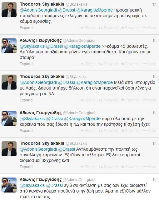 «@Skylakakis @Drassi εγώ σε αντίθεση με σας δεν έχω διοριστεί από κανένα κόμμα πουθενά στην ζωή μου. Άρα τα εξ´ιδίων μάλλον πείτε τα σε σας», αναφέρει το «τιτίβισμα» του κ. Γεωργιάδη.