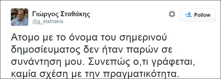Ο κ. Σταθάκης έγραψε στο twitter: «Άτομο με το όνομα του σημερινού δημοσιεύματος δεν ήταν παρών σε συνάντηση μου. Συνεπώς ο,τι γράφεται, καμία σχέση με την πραγματικότητα».