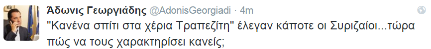«”Κανένα σπίτι στα χέρια Τραπεζίτη” έλεγαν κάποτε οι Συριζαίοι…τώρα πώς να τους χαρακτηρίσει κανείς;», έγραψε ο κ. Γεωργιάδης.