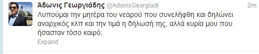 “Λυπούμαι τη μητέρα του νεαρού που συνελήφθη και δηλώνει αναρχικός, αλλά”, σχολιάζει στο twitter ο Άδωνις Γεωργιάδης.