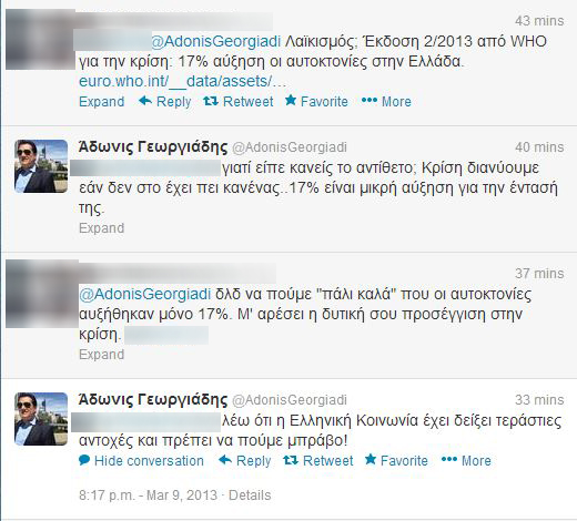 Συγκεκριμένα, ο εν λόγω χρήστης του twitter, έστειλε στον κ. Γεωργιάδη το link του ευρωπαϊκού ιστότοπου www.euro.who.int, στον οποίο παρουσιάζονται οι συνέπειες της οικονομικής κρίσης στον τομέα της υγείας σε χώρες της ευρωπαϊκής επικράτειας. Σύμφωνα με τα στοιχεία του euro.who.int, οι αυτοκτονίες στην Ελλάδα έχουν αυξηθεί κατά 17%, ποσοστό που κατά την άποψη του βουλευτή της ΝΔ, αποτελεί “μικρή αύξηση”, όπως σημειώνει χαρακτηριστικά.