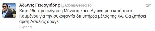 Μέσω Twitter ενημέρωσε νωρίτερα ο βουλευτής της ΝΔ, Άδωνις Γεωργιάδης, ότι προσέφυγε στη δικαιοσύνη κατά του Προέδρου των Ανεξάρτητων Ελλήνων, Πάνου Καμμένου.