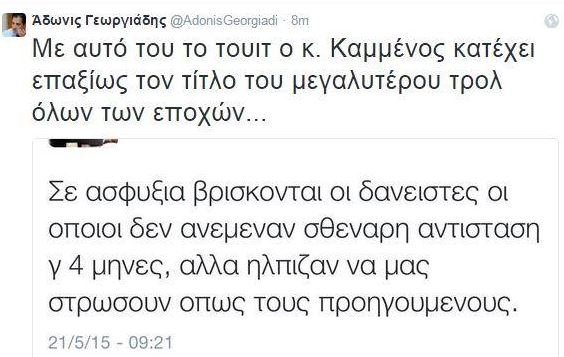 Ως το «μεγαλύτερο τρολ όλων των εποχών» χαρακτηρίζει Άδωνις Γεωργιάδης τον βουλευτή των Ανεξαρτήτων Ελλήνων, Δημήτρη Καμμένο.