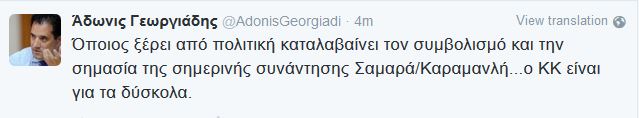 Τη συνάντηση του Αντώνη Σαμαρά, με τον Κώστα Καραμανλή, στην Κηφισιά, σχολιάζει ο κοινοβουλευτικός εκπρόσωπος της Νέας Δημοκρατίας, ο Άδωνις Γεωργιάδης, με ανάρτηση του στο Twitter. Συγκεκριμένα, ο κ. Γεωργιάδης έγραψε: «Όποιος ξέρει από πολιτική καταλαβαίνει τον συμβολισμό και την σημασία της σημερινής συνάντησης Σαμαρά/Καραμανλή. Ο Κώστας Καραμανλής είναι για τα δύσκολα».
