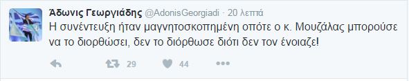 Συγκεκριμένα, ο κ. Γεωργιάδης έγραψε στο Twitter: «Η συνέντευξη ήταν μαγνητοσκοπημένη οπότε ο κ. Μουζάλας μπορούσε να το διορθώσει, δεν το διόρθωσε διότι δεν τον ένοιαζε».