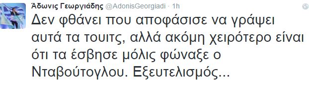 «Δεν φθάνει που αποφάσισε να γράψει αυτά τα τουιτς, αλλά ακόμη χειρότερο είναι ότι τα έσβησε μόλις φώναξε ο Νταβούτογλου. Εξευτελισμός…» έγραψε στον λογαριασμό του στο twitter ο κ.Γεωργιάδης.