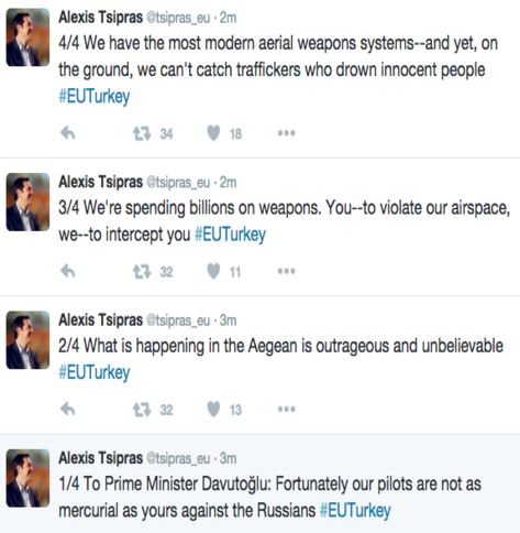 Ο υποψήφιος πρόεδρος της Νέας Δημοκρατίας, Άδωνις Γεωργιάδης κατηγορεί τον Έλληνα Πρωθυπουργό, Αλέξη Τσίπρα ότι έσβησε τα σχόλιά του στο twitter – που ήταν γραμμένα στα αγγλικά – σχετικά με τους Έλληνες πιλότους και την ψυχραιμία τους στις τουρκικές παραβιάσεις, σε συνδυασμό με την κατάρριψη του ρωσικού μαχητικού.
