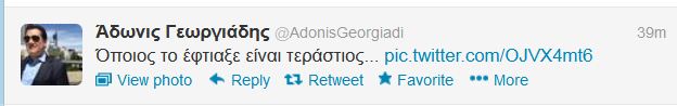 Άδωνις: Ο Τσίπρας ως ΓΑΠ… Enikos Newsroom 12:26, Σάββατο 02 Φεβρουαρίου 2013 πολιτική Άδωνις :Ο Τσίπρας ως ΓΑΠ… Ενθουσιασμένος ο Άδωνις Γεωργιάδης, επαινεί τον δημιουργό της φωτογραφίας που βλέπετε. TWITTER ΑΔΩΝΙΣ ΑΔΩΝΙΣ ΓΕΩΡΓΙΑΔΗΣ Μοιράσου το: σχολίασε κι εσύ (0 σχόλια) Ακολουθήστε το enikos.gr στο Google News και μάθετε πρώτοι όλες τις ειδήσεις Δείτε όλες τις τελευταίες ειδήσεις από την Ελλάδα και τον Κόσμο στο enikos.gr Ειδήσεις Ροή Ειδήσεων 2 ώρες πριν ΣΥΡΙΖΑ: Διαγράφεται ο ευρωβουλευτής Νίκος Παππάς μετά την μήνυση δημοσιογράφου για ξυλοδαρμό 43 λεπτά πριν Τουρκία: Επιδιώκει την επιστροφή των S-400 στη Ρωσία – Οι αμερικανικές πιέσεις 54 λεπτά πριν ΟΠΕΚΕΠΕ: Ελεύθερες με όρους η σύζυγος και η αδελφή του φερόμενου αρχηγού – Τι υποστήριξαν 3 ώρες πριν Πώς στήθηκε η επιχείρηση «Ίπαλλος» που οδήγησε στη σύλληψη του «Έλληνα Εσκομπάρ» – «Ο πόλεμος ενάντια στους εμπόρους ναρκωτικών θα συνεχιστεί» 3 ώρες πριν Κυψέλη: Στη φυλακή η 16χρονη που μαχαίρωσε συμμαθήτριά της 3 ώρες πριν Τα 3 ζώδια που θα δουν τη ζωή τους να αλλάζει ριζικά το 2026 – «Όλα γίνονται καλύτερα σταδιακά» 8 ώρες πριν «Δεν είχα κλάψει από τότε που διαγνώστηκα με καρκίνο, ώσπου ένα τηλεφώνημα με έκανε να λυγίσω» – Η συγκλονιστική εξομολόγηση ενός άνδρα 4 ώρες πριν Ο σπάνιος σεισμός που έλυσε τα χέρια των επιστημόνων – Αποκάλυψε ακριβώς όσα αναζητούσαν 10 ώρες πριν 20 χρόνια τα Χριστούγεννα ξεκινούν στα Public με μεγάλη ποικιλία σε δώρα! 5 λεπτά πριν ΑΑΔΕ: Καταβλήθηκε η τέταρτη δόση επιστροφής ΕΦΚ αγροτικού πετρελαίου – Οδηγίες για τη διόρθωση παραστατικών 10 λεπτά πριν Μητσοτάκης: Το γούρι με τα αρχικά του για το 2026 που έδωσε στους βουλευτές της ΝΔ – ΦΩΤΟ 14 λεπτά πριν Καβάλα – Παναθηναϊκός 1-2: Ο Ταμπόρδα έστειλε τους Πράσινους απευθείας στα προημιτελικά του Κυπέλλου Ελλάδας 19 λεπτά πριν Δημήτρης Ήμελλος: Η συγκινητική ανάρτηση της αδελφής του, για τον ένα χρόνο από τον θάνατό του – «Πήγες στον Θεό για να μας θυμίσεις…» 24 λεπτά πριν Κρήτη: Η ανακοίνωση της ΕΛΑΣ για την σύλληψη του 54χρονου – Ζήτησε 5.000 ευρώ από την οικογένεια του 33χρονου γιατρού για να τον βρει μέσω «κβαντικής τεχνολογίας» ENIKOS NETWORK 2,6 εκατομμύρια πολίτες έχουν ήδη εμβολιαστεί κατά της γρίπης Σοβαροί κίνδυνοι από τη λάθος χορήγηση φαρμάκου για τις αιμορραγίες-Συστάσεις προς τους γιατρούς Υπουργείο Εργασίας: Ο οδικός χάρτης για την ενίσχυση του πλαισίου των Συλλογικών Διαπραγματεύσεων – Οι 5 άξονες του σχεδίου... Έρχεται νέα ενίσχυση 17.500 ευρώ από τη ΔΥΠΑ για ανέργους- Όλες οι λεπτομέρειες Χαρτογραφώντας το «σημείο χωρίς επιστροφή»: Για πρώτη φορά αποκαλύπτεται με λεπτομέρεια το ακανθώδες όριο της ατμόσφαιρας τ... Η Google καταργεί τη λειτουργία «dark web report» – Πώς θα μπορούν οι χρήστες να διαγράφουν τα δεδομένα τους περισσότερα 18:13 , Τετάρτη 17 Δεκεμβρίου 2025 Στις Βρυξέλλες ο Κυριάκος Μητσοτάκης για τη Σύνοδο Κορυφής ΕΕ-Δυτικών Βαλκανίων και τη συνεδρίαση του Ευρωπαϊκού Συμβουλίου Στις Βρυξέλλες μεταβαίνει ο Κυριάκος Μητσοτάκης προκειμένου να συμμετάσχει απόψε στη Σύνοδο Κο... 17:38 , Τετάρτη 17 Δεκεμβρίου 2025 Παύλος Μαρινάκης για Νίκο Παππά: Έπρεπε να χειροδικήσει για να αναγκαστεί ο ΣΥΡΙΖΑ να τον διαγράψει «Έπρεπε να χειροδικήσει για να αναγκαστεί ο ΣΥΡΙΖΑ να τον διαγράψει», τονίζει ο κυβερνητικός ε... 17:09 , Τετάρτη 17 Δεκεμβρίου 2025 ΣΥΡΙΖΑ: Διαγράφεται ο ευρωβουλευτής Νίκος Παππάς μετά την μήνυση δημοσιογράφου για ξυλοδαρμό Εκτός της ευρωομάδας του ΣΥΡΙΖΑ-ΠΣ 