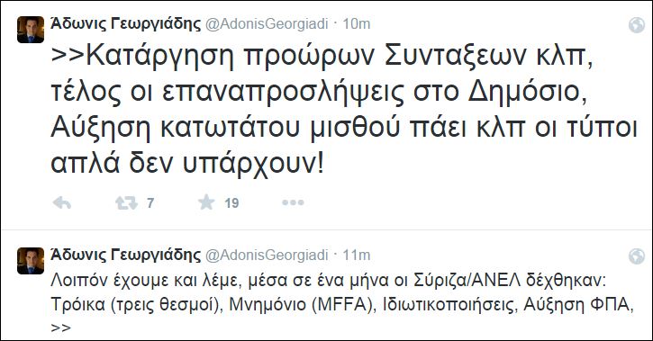 «Λοιπόν έχουμε και λέμε, μέσα σε ένα μήνα οι Σύριζα/ΑΝΕΛ δέχθηκαν: Τρόικα (τρεις θεσμοί), Μνημόνιο (MFFA), Ιδιωτικοποιήσεις, Αύξηση ΦΠΑ, Κατάργηση προώρων Συνταξεων κλπ, τέλος οι επαναπροσλήψεις στο Δημόσιο, Αύξηση κατωτάτου μισθού πάει κλπ οι τύποι απλά δεν υπάρχουν!», έγραψε ο κ. Γεωργιάδης.