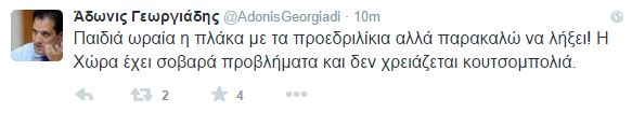 «Παιδιά ωραία η πλάκα με τα προεδριλίκια αλλά παρακαλώ να λήξει! Η Χώρα έχει σοβαρά προβλήματα και δεν χρειάζεται κουτσομπολιά», αναφέρει το «τιτίβισμα» του κοινοβουλευτικού εκπροσώπου της Νέας Δημοκρατίας.