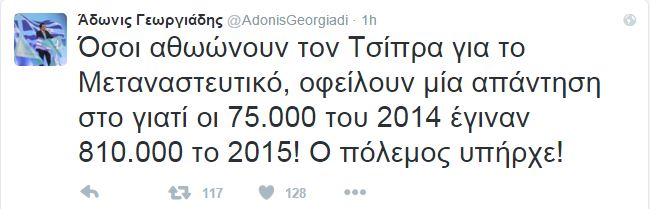 Οξεία κριτική στον Πρωθυπουργό Αλέξη Τσίπρα, με αφορμή την προσφυγική κρίση και το μεταναστευτικό, ασκεί ο αντιπρόεδρος της Νέας Δημοκρατίας, Άδωνις Γεωργιάδης με ανάρτηση που έκανε στο Facebook, επισημαίνοντας ότι «ο πόλεμος υπήρχε».