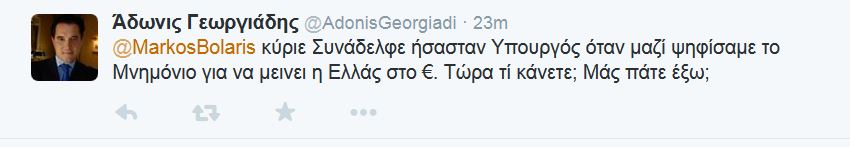 Στο tweet του Μάρκου Μπόλαρη απάντησε ο Άδωνις Γεωργιάδης, λέγοντάς του ότι μαζί ψήφισαν το μνημόνιο για μείνει η Ελλάδα στο ευρώ.