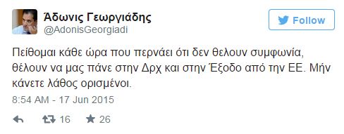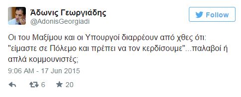 «Οι του Μαξίμου και οι Υπουργοί διαρρέουν από χθες ότι: “είμαστε σε Πόλεμο και πρέπει να τον κερδίσουμε”…παλαβοί ή απλά κομμουνιστές;», έγραψε χαρακτηριστικά ο Άδωνις Γεωργιάδης, ενώ νωρίτερα σημείωσε: