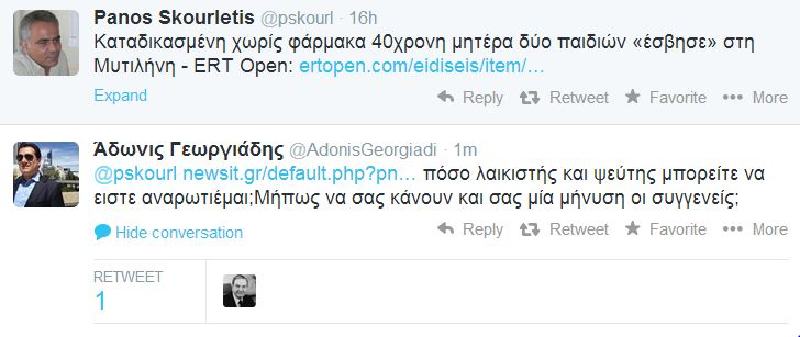 «Πόσο λαϊκιστής και ψεύτης μπορείτε να είστε αναρωτιέμαι; Μήπως να σας κάνουν και σας μια μήνυση οι συγγενείς;», απάντησε χαρακτηριστικά ο Α. Γεωργιάδης στον Πάνο Σκουρλέτη.