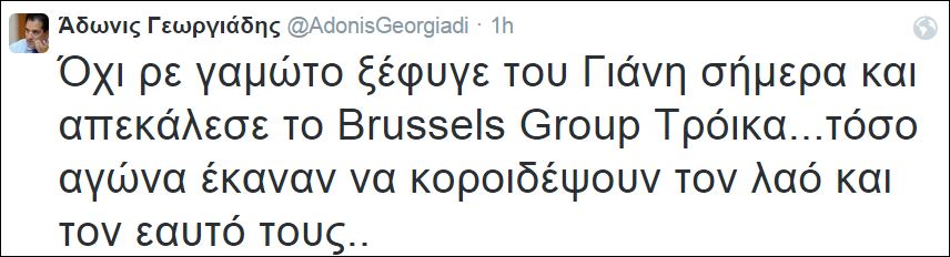 «Όχι ρε γαμώτο ξέφυγε του Γιάνη σήμερα και απεκάλεσε το Brussels Group Τρόικα… τόσο αγώνα έκαναν να κοροϊδέψουν τον λαό και τον εαυτό τους..», έγραψε ο Άδωνις Γεωργιάδης.