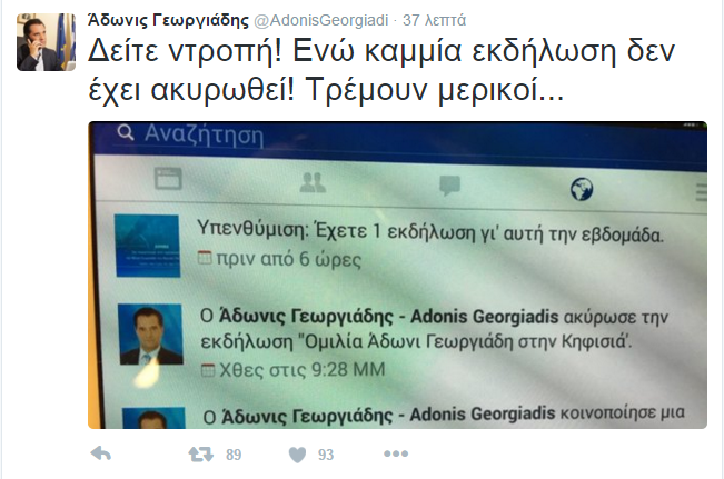 Συγκεκριμένα, ο κ. Γεωργιάδης έγραψε στο Twitter: «Δείτε ντροπή. Ενώ καμία εκδήλωση δεν έχει ακυρωθεί. Τρέμουν μερικοί…» και ανήρτησε την ανάλογη φωτογραφία.