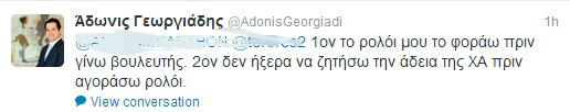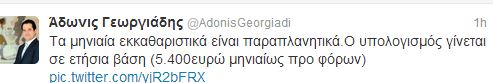 «Τα μηνιαία εκκαθαριστικά είναι παραπλανητικά. Ο υπολογισμός γίνεται σε ετήσια βάση (5.400ευρώ μηνιαίως προ φόρων)», ήταν το σχόλιο του Άδωνι Γεωργιάδη, ο οποίος απάντησε μέσω του Twitter και στον βουλευτή επίσης της Χρυσής Αυγής Γιώργο Γερμενή, που τον κατηγόρησε ότι φοράει «ρόλεξ 7.000 ευρώ».