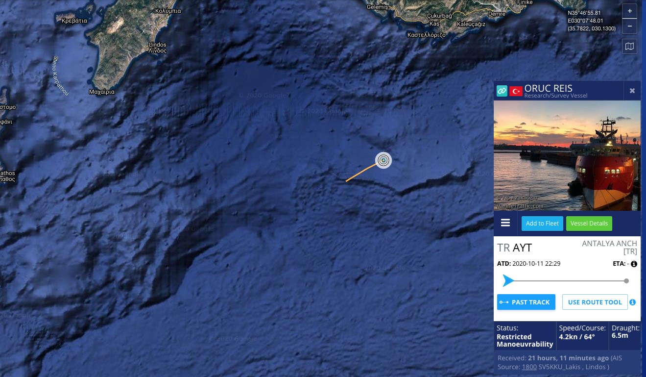Εδώ και 21 ώρες έχει κλειστό το AIS, δηλαδή το σύστημα γεωγραφικού εντοπισμού, το οποίο το άνοιξε για πολύ λίγη ώρα κάποια στιγμή χθες τα ξημερώματα. Το ίδιο και τα δύο του συνοδευτικά πλοία υποστήριξης, τα Attaman και Cengizhan.