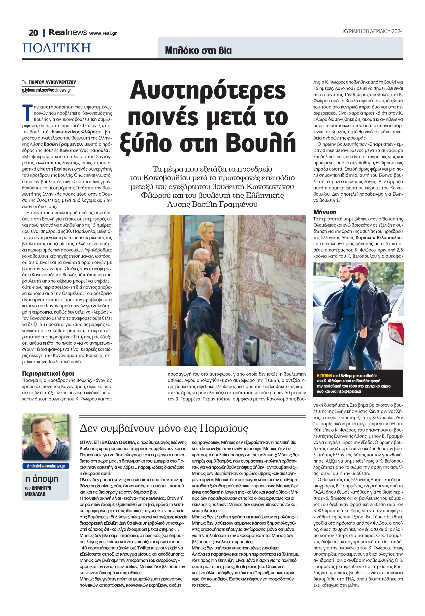 Πράγματι, ο πρόεδρος της Βουλής, κάνοντας χρήση όχι μόνο του Κανονισμού, αλλά και των σχετικών διατάξεων του ποινικού κώδικα, πέτυχε την άμεση σύλληψη του Κ. Φλώρου και την προσαγωγή του στο αυτόφωρο, για το οποίο δεν ισχύει η βουλευτική ασυλία. Αφού απολογήθηκε στο αυτόφωρο την Πέμπτη, ο ανεξάρτητος βουλευτής αφέθηκε ελεύθερος, ωστόσο του επιβλήθηκε ο περιοριστικός όρος να μην πλησιάζει σε απόσταση μικρότερη των 50 μέτρων τον Β. Γραμμένο. Πέραν τούτου, σύμφωνα με τον Κανονισμό της Βουλής, ο Κ. Φλώρος αποβλήθηκε από τη Βουλή για 15 ημέρες. Αυτό που πρέπει να σημειωθεί είναι ότι η ποινή της 15νθήμερης αποβολής του Κ. Φλώρου από τη Βουλή αφορά την πρόσβασή του τόσο στο κεντρικό κτίριο όσο και στα περιφερειακά. Είναι χαρακτηριστικό ότι στον Κ. Φλώρο διαμηνύθηκε ότι, ακόμα κι αν ήθελε να πάρει τη μοτοσικλέτα του από το υπόγειο πάρκινγκ της Βουλής, αυτό θα γινόταν μόνο συνοδεία ανδρών της φρουράς.