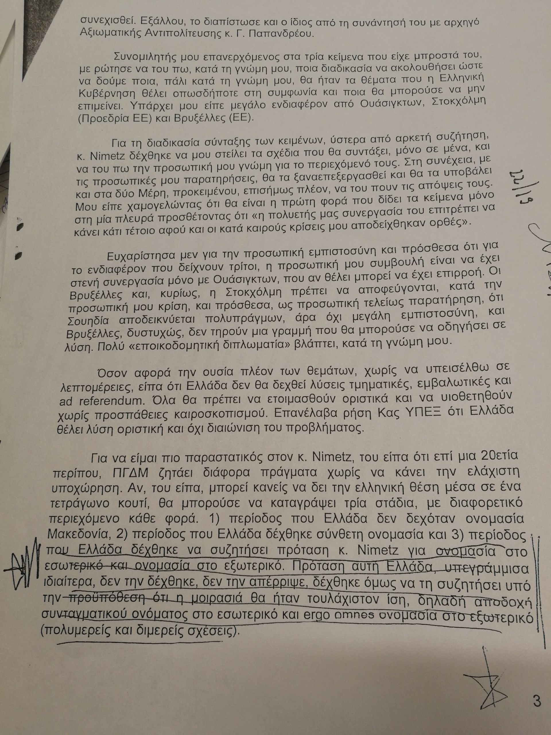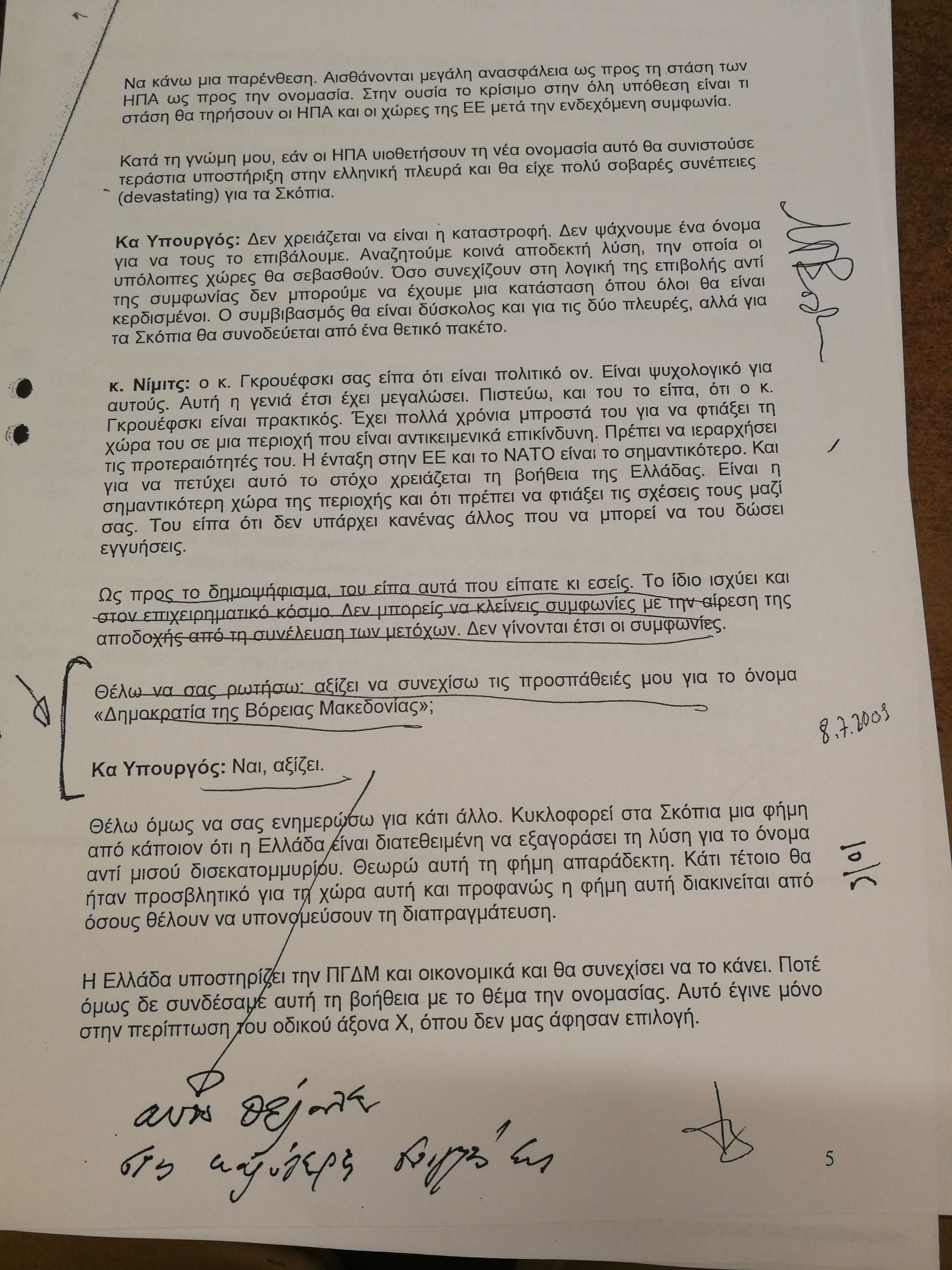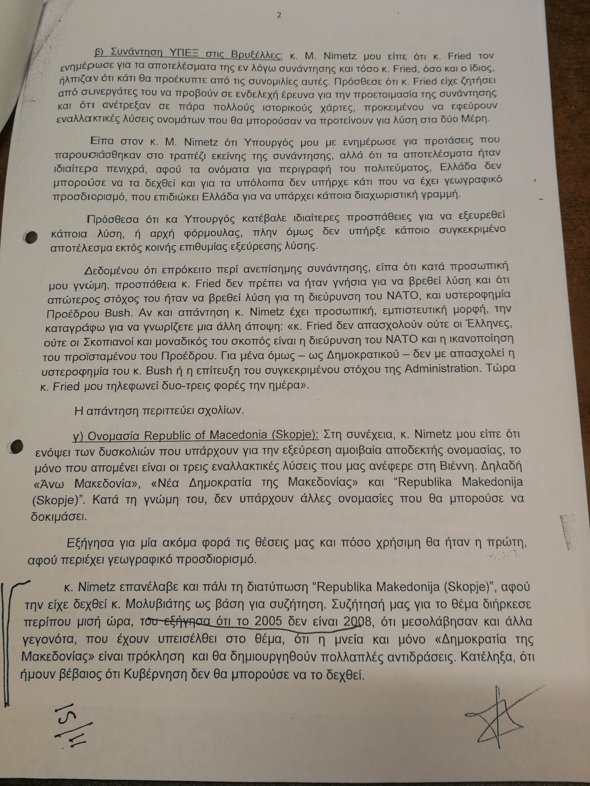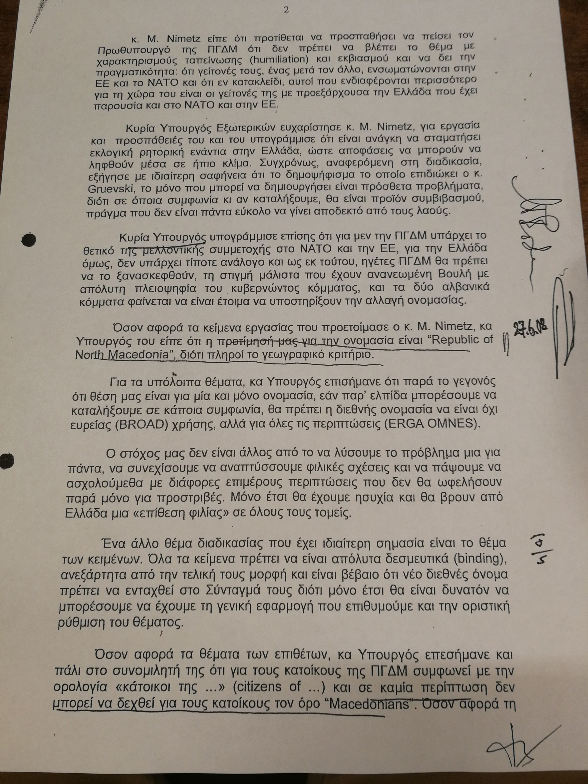 Όπως ανέφερε ο Υπουργός Εξωτερικών, με τα συγκεκριμένα έγγραφα που κατέθεσε, έφερε στο «φως» τα στοιχεία που καταδεικνύουν ότι η ΝΔ είχε πει «ναι» στο Βόρεια Μακεδονία όντας κυβέρνηση και ότι με την τωρινή συμφωνία για πρώτη φορά έγινε αποδεκτή από τους γείτονες η erga omnes χρήση σύνθετης ονομασίας στο εσωτερικό και διεθνώς.